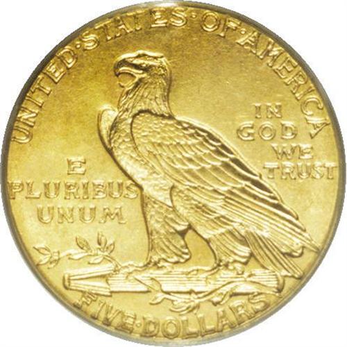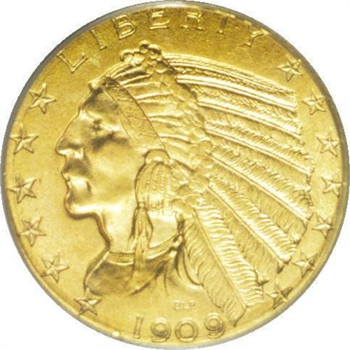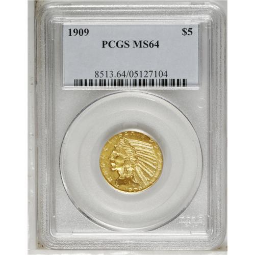 <B>1909 $5 MS64 PCGS.</B></I> This MS64 example exhibits a couple of shades of apricot-gold with light greenish undertones. Excellent definition is noted on the design elements. There are no marks evident that would seem to prevent an even higher grade assessment. A tiny but interesting tear-shaped strike-through is noted beneath the beak. A very attractive near-Gem specimen.<BR><BR><b>Shipping:</b> Coin/Currency (<a target="_blank" href="http://www.heritageauctions.com/common/shipping.php">view shipping information</a>)