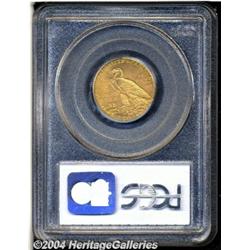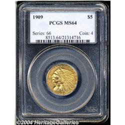 <B>1909<$5> MS64 PCGS.</B></I> Reddish-gold toning gives this lovely near-Gem an unmistakably original appearance, and the surfaces display minimal abrasions for the grade. Well-struck for the issue and with excellent eye appeal for the grade, this lovely piece should appeal to any type collector or specialist in this series. <BR><BR><B>Important notice:</B> Heritage usually auctions material at the rate of 200-250 lots per hour. On some occasions eBay Live bid software or the Internet may not be able to keep up with the pace of the auction. We recommend placing a realistic absentee bid now as insurance to avoid disappointment. Occasionally the auctioneer may eliminate or reject an eBay Live bid, and the auctioneer may also reopen a lot after the close of the eBay live bidding (usually because we missed an audience bid), and may reject your bid even if it shows you as the winning bidder. By bidding via eBay Live, you agree that Heritage may award the lot to another bidder at its sole discretion under the circumstances described above or any other reasonable circumstances. Since eBay bids are not shown to us until we open the lot on the floor, we treat those bids just like floor bids. In most cases the floor responds before the eBay bid is presented to us, due to Internet lag time, so for consistency we have made it a policy that floor bids are always considered first over tie eBay live bids. Also please note that all Heritage lots purchased through eBay Live carry a 20% Buyer's Premium. Please make sure you read the Terms and Conditions before you bid.