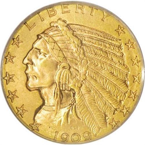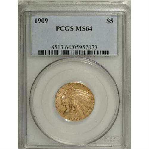 <B>1909 $5 MS64 PCGS.</B></I> Satiny surfaces display pleasing honey-gold color with sharp design features. This is a common date, yet it is difficult to locate in grades finer than this piece. A few tiny surface marks are primarily seen on the reverse, defining the grade assigned by PCGS.<BR><BR><B>Coin Engraver:</B> Bela Lyon Pratt<BR><BR><b>Shipping:</b> Coins & Currency (<a target="_blank" href="http://www.heritageauctions.com/common/shipping.php">view shipping information</a>\)