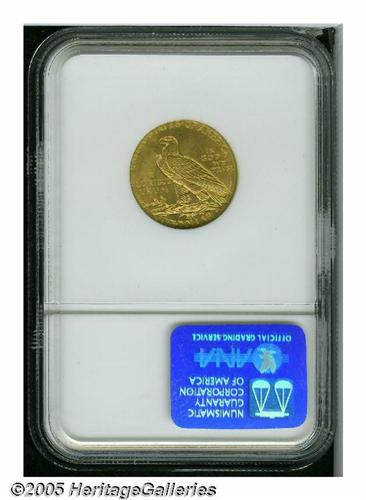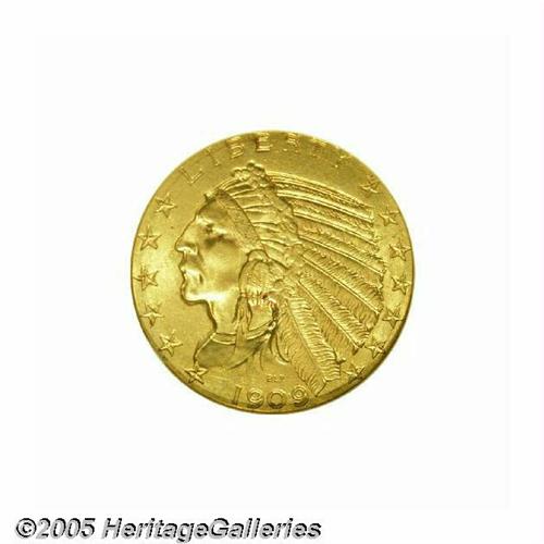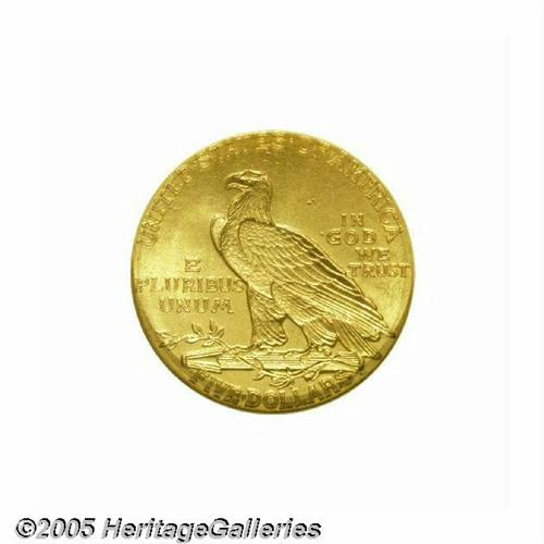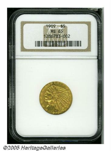 <B>1909<$5> MS65 NGC.</B></I> This second year of issue had a rather substantial mintage of 627,138 pieces, but unlike its 1908 predecessor, was not saved in the same numbers. Fewer than a hundred Gems are believed known today, approximately half as many as the 1908. This is an especially attractive and problem-free coin that displays a full strike in all areas and rich green-gold coloration. The fields are noteworthy for their clean appearance, the only mark of note being a milling mark located above the eagle's wing on the reverse.