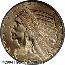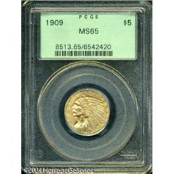 1909 $5 MS65 PCGS. This outstanding Gem has above <B>1909 $5 MS65 PCGS.</B></I> This outstanding Gem has above average eye appeal for the grade, and even possible claims to the MS66 grade. It is well struck, has gorgeous luster, and is free of all but the tiniest abrasions. A wonderful coin for a high grade set of Indian Fives or for a Gem type set, this piece will be appreciated by its new owner both for its technical merit and its outstanding aesthetic qualities. Population: 70 in 65, 4 finer (11/04). <BR><BR><B>Important notice:</B> Heritage usually auctions material at the rate of 200-250 lots per hour. On some occasions eBay Live bid software or the Internet may not be able to keep up with the pace of the auction. We recommend placing a realistic absentee bid now as insurance to avoid disappointment. Occasionally the auctioneer may eliminate or reject an eBay Live bid, and the auctioneer may also reopen a lot after the close of the eBay live bidding (usually because we missed an audience bid), and may reject your bid even if it shows you as the winning bidder. By bidding via eBay Live, you agree that Heritage may award the lot to another bidder at its sole discretion under the circumstances described above or any other reasonable circumstances. Since eBay bids are not shown to us until we open the lot on the floor, we treat those bids just like floor bids. In most cases the floor responds before the eBay bid is presented to us, due to Internet lag time, so for consistency we have made it a policy that floor bids are always considered first over tie eBay live bids. Also please note that all Heritage lots purchased through eBay Live carry a 20% Buyer's Premium. Please make sure you read the Terms and Conditions before you bid. This lot is being auctioned in conjunction with a live floor auction by Heritage Galleries & Auctioneers. All final auction and invoice information will be supplied by Heritage Galleries & Auctioneers, and all other information should be considered preliminary. Lot:6697
