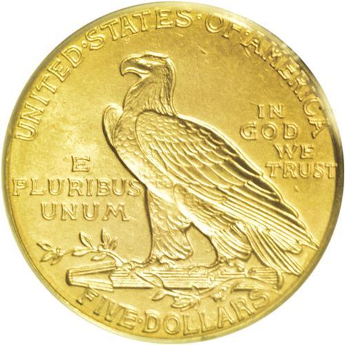 <B>1909<$5> MS65 PCGS.</B></I> While examples of this issue exist by the hundreds in the lower echelons of Mint State, in strict Gem condition, their numbers are counted only in the dozens. The present specimen shows beautiful luster underneath pretty antique-gold surfaces, with glints of hazel in the protected crevices of the Indian device. Both sides are noteworthy for their lack of all but the most minuscule evidence of contact. And that most elusive of all attributes--eye appeal--is even more noteworthy. Only five examples are graded finer at PCGS (7/06).