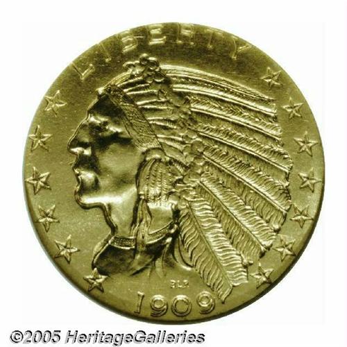 <B>1909<$5> PR66 NGC.</B></I> Struck in the rare and highly coveted "Roman Finish" used only in 1909 and 1910, the surfaces of this piece are much lighter in color than the 1908 and also more minutely granular, this finish being a curious mixture between a brilliant and matte proof, giving the coin a semi-brilliant, satiny appearance. These coins have often been confused with high-grade business strikes, but seen side by side one can easily see a difference in the texture of the surfaces. Only 78 proofs were made, the 1909 being a rarer issue than other dates from 1908-13. We estimate that probably 30-40 pieces still exist today of this rarely seen issue. <BR> The coin has a wire rim on the right portion of the reverse, and a small abrasion just to the left of the Indian's upper lip. An impeccable, boldly struck, first class example that is worthy of the finest collection of proof gold.