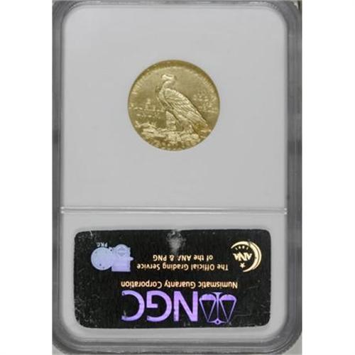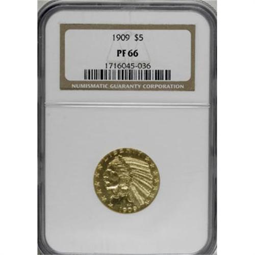 <B>1909 $5 PR66 NGC.</B></I> A decade or so after matte proof gold coins became the rage in the European capitals of London and Paris, personnel at the U.S. Mint also began tinkering with new surface finishes for proof gold. Following the Mint introduction of the novel and highly unpopular matte finish for proof gold of the new designs by Saint-Gaudens and Pratt in 1908, the April 1909 <I>The Numismatist </B></I>said of the coins that they "have a very dull appearance ... and are far less pleasing to the eye than the coinage for circulation, which is brighter and of lighter color." The Mint in 1909 and 1910 softened its approach to the now-rare and highly coveted "Roman Finish," sometimes called Roman Gold or Satin Finish, and used only in those two years. Of the new style, the authors of <I>The Coinage of Augustus Saint-Gaudens as Illustrated by the Phillip H. Morse Collection </B></I>noted, "The finish on this variant had a brighter appearance and the individual granules on the surface show a finer texture than the earlier 'matte' or 'sandblast' proofs of 1908. Indeed, the new finish was a response to criticism that the earlier matte finish exuded a dull appearance, and in general, was disliked by contemporary collectors. Unlike the various shades of olive-brown or mustard-brown on the 1908 sandblast proofs, satin or 'Roman Finish' proofs tend to exhibit a pleasing yellow-gold coloration with occasional orange accents."<BR> The surfaces of this piece are much lighter in color than the 1908 and more minutely granular. The finish is a curious mixture between a brilliant and matte proof that gives the coin a semibrilliant, satiny appearance. The Roman Finish coins have often been confused with high-grade business strikes, but when the two types of coins are viewed side by side, one can easily see differences in the surface textures. The recorded <I>Guide Book </B></I>proof mintage of the 1909 is only 78 coins, a lower number likely accounted for by the disappointment proof gold collectors felt for the 1908 pieces. (Garrett and Guth's <I>Gold Encyclopedia </B></I>notes that the mintage is "77 Roman style finish" and that there is also a single known matte proof 1909, struck in the same style as the 1908 pieces.)<BR> Based on the certified populations and a reasonable assumption for duplications, we estimate that probably 30-40 pieces still exist today of this rarely seen issue. This piece is one of seven coins so graded at NGC, with 11 pieces finer, while PCGS has certified three coins in PR66, with one finer (12/07)<BR> The coin has a wire rim on the right portion of the reverse, and a small abrasion just to the left of the Indian's upper lip, yet it remains a near-impeccable, boldly struck, first-class example that is worthy of the finest collection of proof gold.<BR><BR><B>Coin Engraver:</B> Bela Lyon Pratt<BR><BR><b>Shipping:</b> Coins & Currency (<a target="_blank" href="http://www.heritageauctions.com/common/shipping.php">view shipping information</a>)