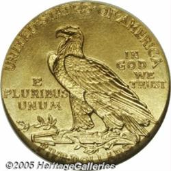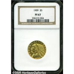 <B>1909 $5 PR67 NGC.</B></I> Unlike the 1908 with its hefty mintage, in 1909 Half Eagles had a sparse production of only 78 proofs. Proofs of this year were difficult to obtain even around the time of their issuance. To reinforce this legend of contemporary scarcity, the story has often been told of how Robert Garrett neglected to order a gold proof set directly from the mint in 1909 and it took until 1913 for Henry Chapman to locate one for him. We would estimate that somewhere between 30 and 40 proofs exist today.<BR> Proofs of this year are of the Roman Gold style, that is, a hybrid semi-brilliant and satiny finish. This brighter proofing process was limited to only this and the following year, and survivors are of the highest order of rarity. This is an exquisite piece of proof gold. The surfaces are bright and satiny with just a touch of light orange patina. Even under strong magnification the coin is essentially flawless. Every striking detail is fully articulated, as one only sees on proofs, and the overall eye appeal of the coin is enormous. Population: 9 in 67, 2 finer (2/05).