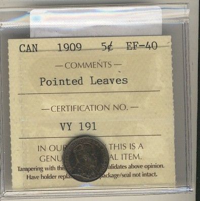 1909 5¢ Ptd & Round Lvs ICCS EF40. Lot of 2 coins.