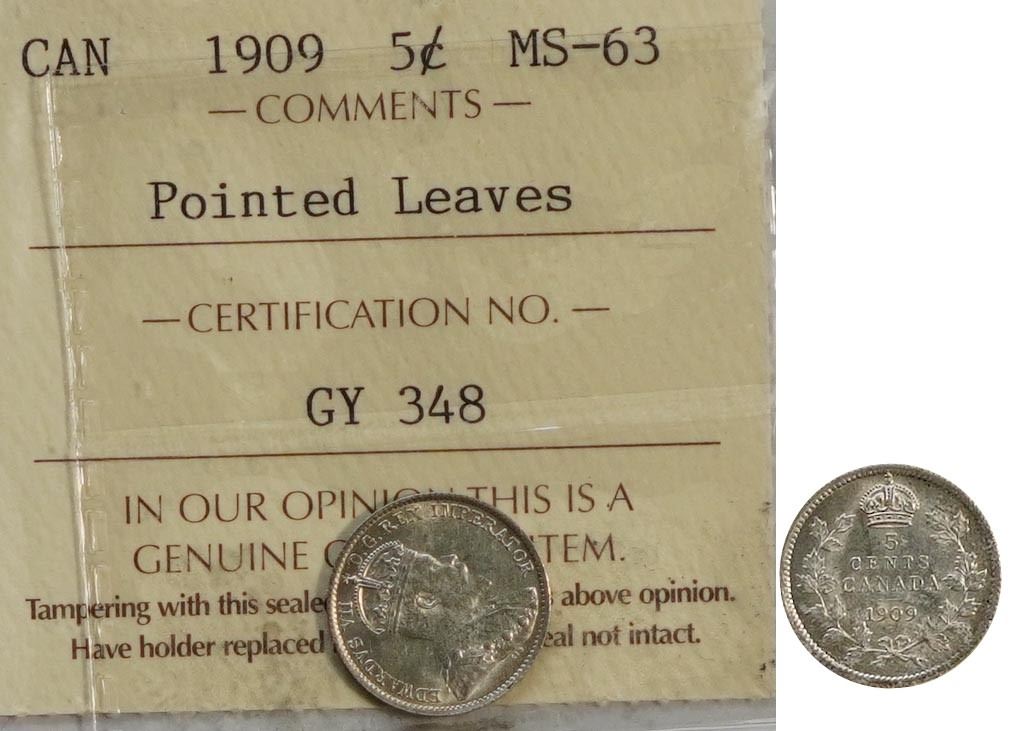1909 5¢ Ptv Lvs ICCS Choice Mint State-63. A nice looking piece.