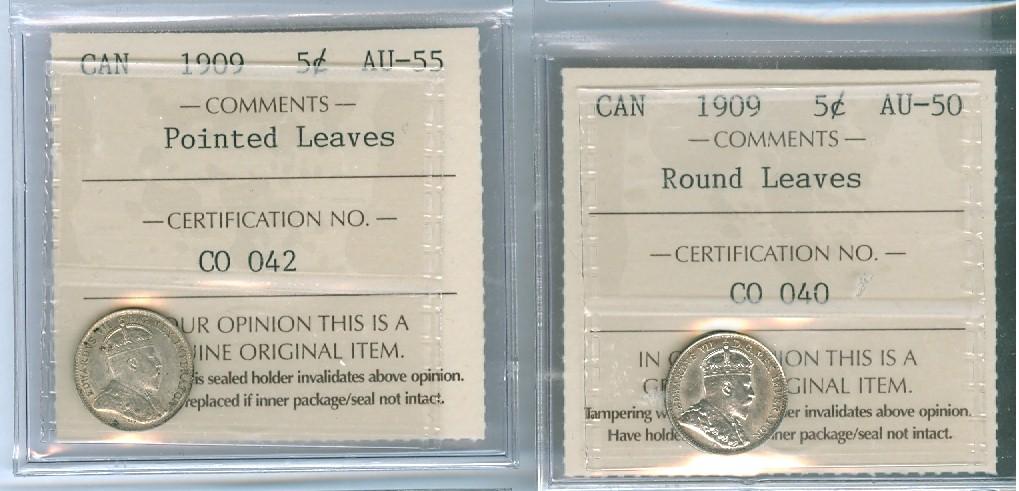 1909 5¢ RL AU50 & 1909 PL AU55. Lot of two ICCS graded examples.