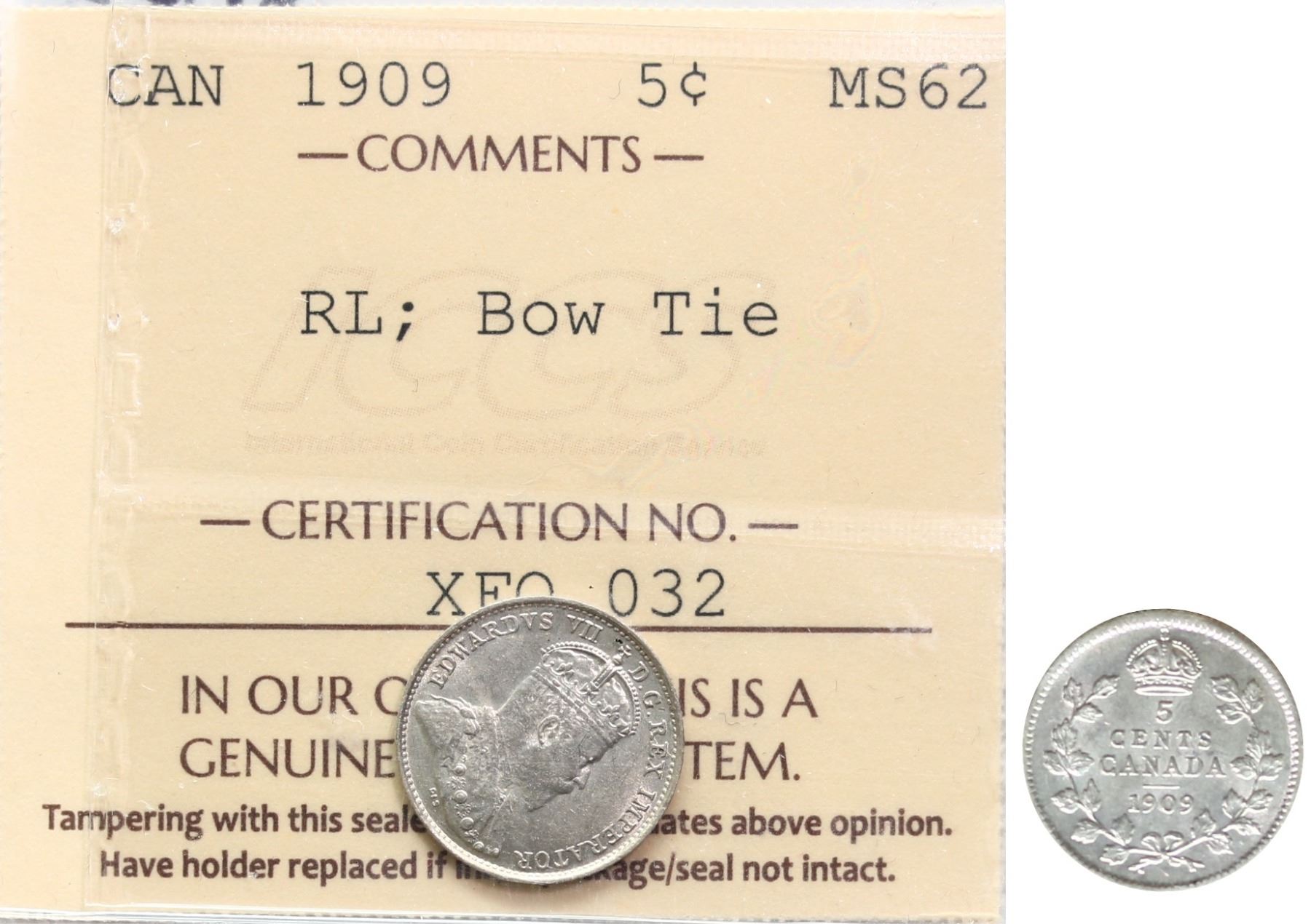 1909 5¢ "RL - BOW TIE" ICCS Choice Mint State-62, Brilliant and lustrous.