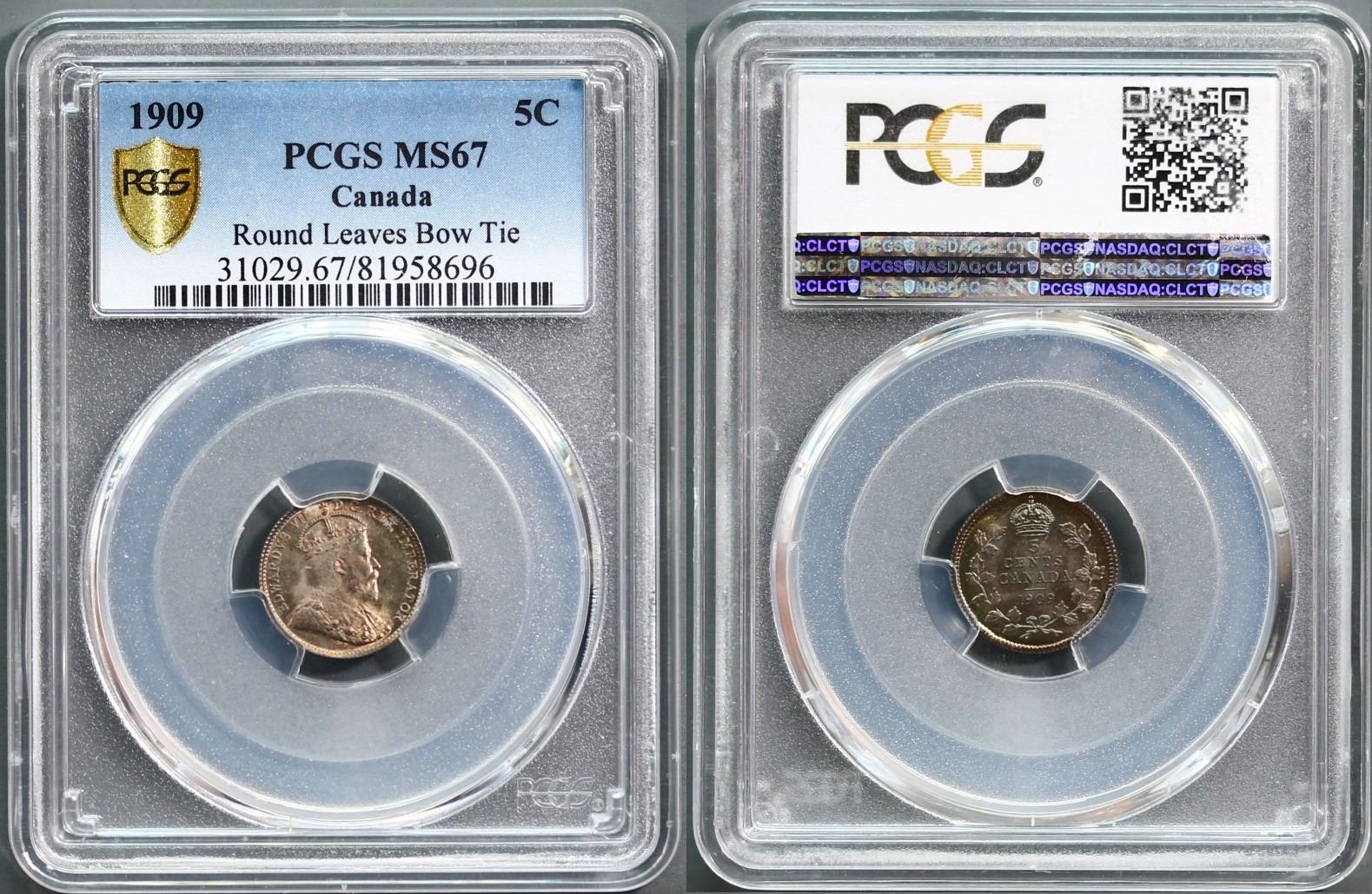 1909 5¢ RL "Bow Tie" PCGS Superb Gem Mint State-67. Absolutely stunning superb gem example displaying a superb misxture of silvers, golds and army green tints under radiant lustrous fields.