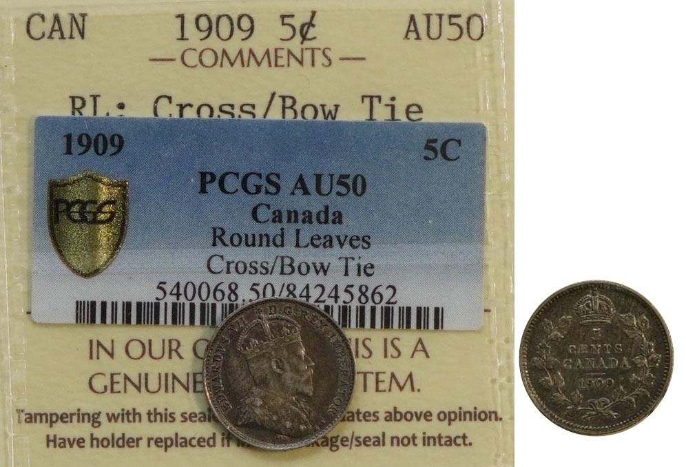 1909 5¢ RL / "Cross/Bow Tie" ICCS About Uncirculated-50.