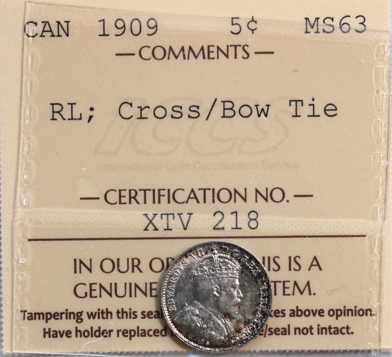 1909 5¢ "RL; Cross Bow Tie" ICCS Choice Mint State-63 Lustrous with lifgt gold, green and russet tones. Rare and not often seen in this condition