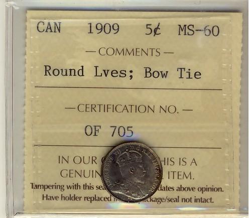 1909 5¢ Rd Lvs ICCS MS60 Lightly toned.