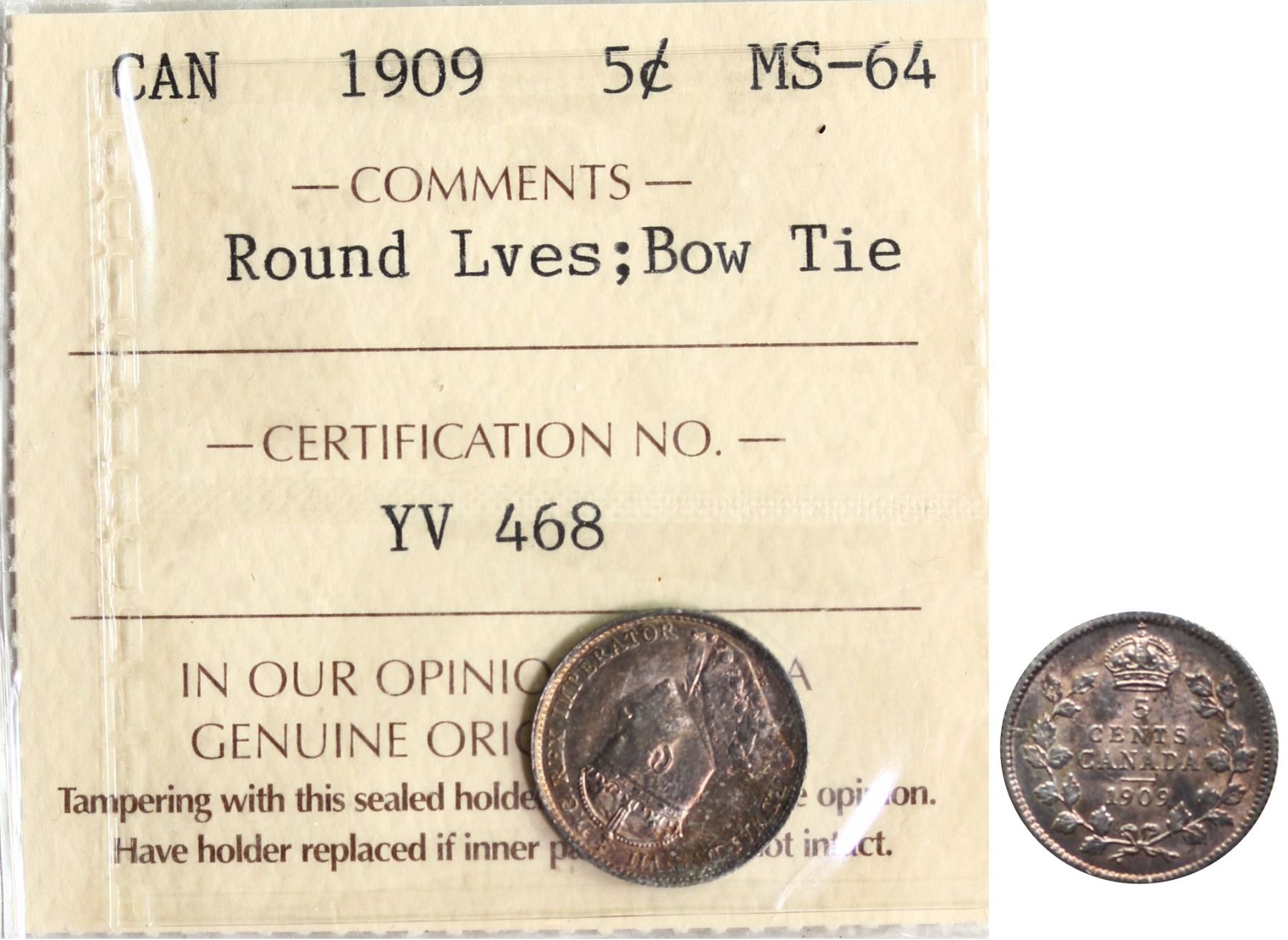 1909 5¢ "Round Leaves - Bow Tie" ICCS Very Choice Mint State-64 Nice gold and russet tones over full underlying lustre.