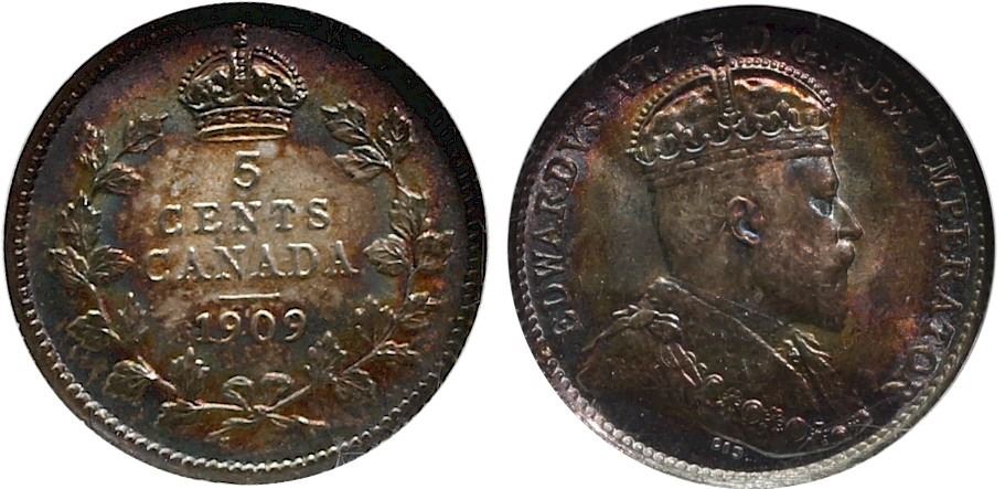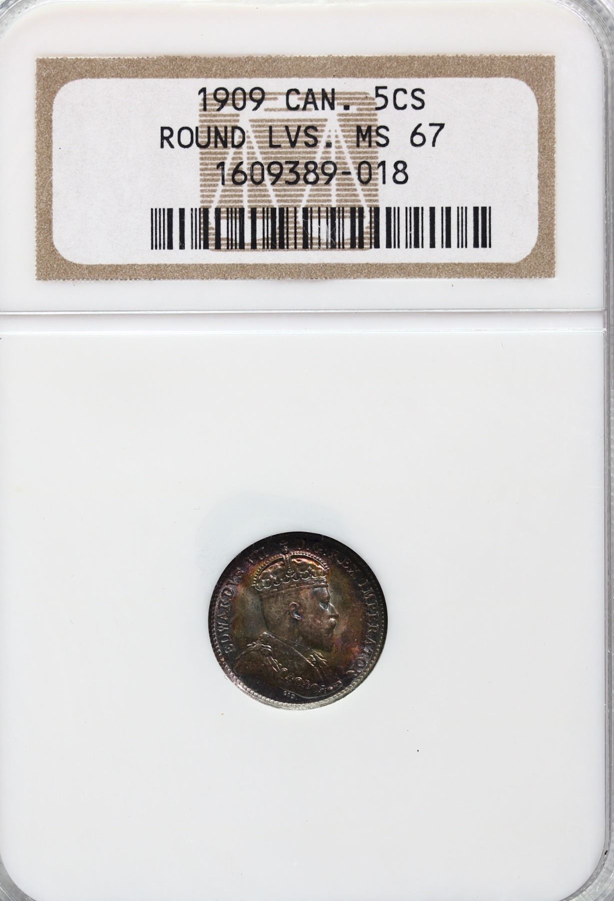1909 5¢ "Round Leaves" NGC Superb Gem Mint State-67. Intense rainbow tones over full underlying lustre.