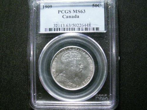 1909 50 Cents PCGS MS63. A full blast white example. Fully struck with strong luster. Cameo contrast on obverse with reflective surfaces. A very nice and superb "Edwardian" type coin. Rare in this condition.