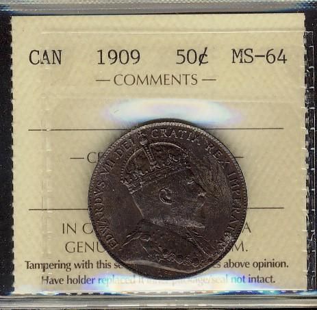 1909 50¢ ICCS MS64. Heavy attractive tone.
