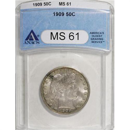 <B>1909 50C MS61 ANACS.</B></I> Areas of peach and violet patina at the margins enliven the otherwise silver-gray surfaces of this unworn Barber half. A number of wispy abrasions on and around the portrait account for the grade.<BR><BR><B>Coin Engraver:</B> Charles E. Barber<BR><BR><b>Shipping:</b> Coins & Currency (<a target="_blank" href="http://www.heritageauctions.com/common/shipping.php">view shipping information</a>)