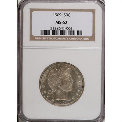 <B>1909 50C MS62 NGC.</B></I> . NGC Census: (27/162). PCGS Population (50/223). Mintage: 2,368,650. Numismedia Wsl. Price for NGC/PCGS coin in MS62: $425. (#6516)<BR><BR><B>Coin Engraver:</B> Charles E. Barber<BR><BR><b>Shipping:</b> Coins & Currency (<a target="_blank" href="http://www.heritageauctions.com/common/shipping.php">view shipping information</a>)