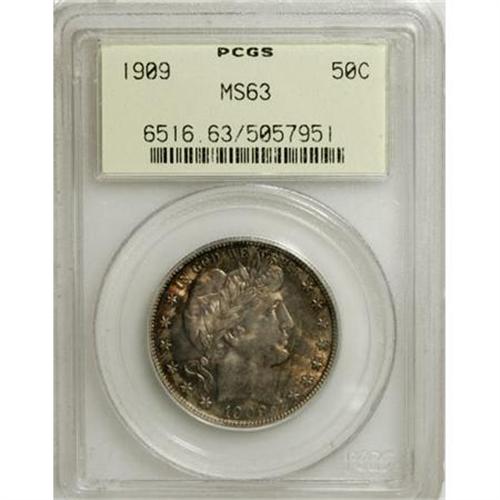 <B>1909 50C MS63 PCGS.</B></I> PCGS Population (59/159). NGC Census: (60/96). Mintage: 2,368,650. Numismedia Wsl. Price for NGC/PCGS coin in MS63: $640. (#6516)<BR><BR><B>Coin Engraver:</B> Charles E. Barber<BR><BR><b>Shipping:</b> Coins & Currency (<a target="_blank" href="http://www.heritageauctions.com/common/shipping.php">view shipping information</a>\)