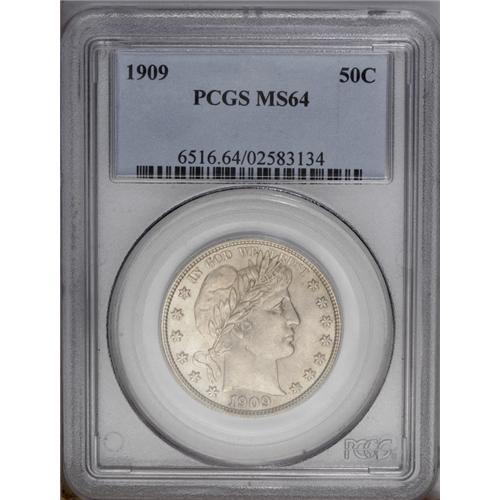 <B>1909 50C MS64 PCGS.</B></I> One of the more frequently encountered P-mint Barber halves, and an excellent type coin selection. The present example has satiny, untoned, light gray surfaces, a good strike save for the hair just above the forehead, and a couple of light ticks on Liberty's neck and face. Appealing and accurately graded. PCGS has graded 50 finer (12/05).