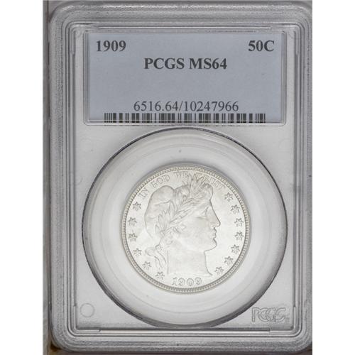 <B>1909<50C> MS64 PCGS.</B></I> The frosty surfaces show excellent cartwheel luster and a subtle bluish-gold patina. The strike is bold, and the reverse is choice for the grade. A few ticks and light abrasions on the obverse preclude an MS65 grade, but this piece is nonetheless quite attractive and at first glance appears to be a Gem.