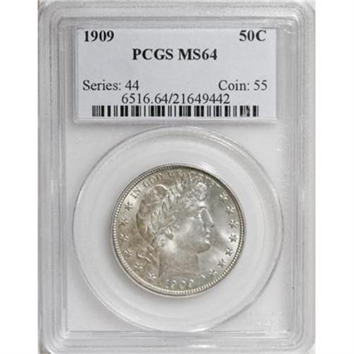 <B>1909 50C MS64 PCGS.</B></I> A strongly lustrous and solidly struck piece, primarily silver-white with occasional blushes of pink and tan. A single thin flaw on Liberty's cheek precludes Gem status.<BR><BR><B>Coin Engraver:</B> Charles E. Barber<BR><BR><b>Shipping:</b> Coins & Currency (<a target="_blank" href="http://www.heritageauctions.com/common/shipping.php">view shipping information</a>)