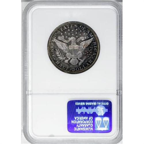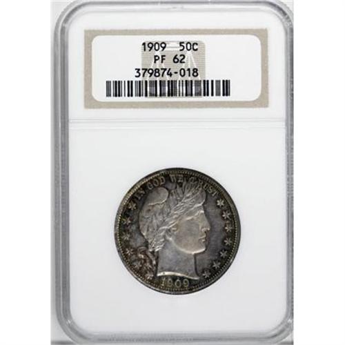 <B>1909 50C PR62 NGC.</B></I> Sea-green, cerulean, and silver-violet are the major colors on this decisively struck proof, though the obverse shows a measure of iridescence as well. Light to moderate hairlines in the fields account for the grade. One of just 650 specimens struck for this 20th century Barber issue.<BR><BR><B>Coin Engraver:</B> Charles E. Barber<BR><BR><b>Shipping:</b> Coins & Currency (<a target="_blank" href="http://www.heritageauctions.com/common/shipping.php">view shipping information</a>)