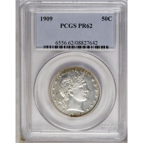 <B>1909<50C> PR62 PCGS.</B></I> A deeply reflective piece with gold, russet, and auburn accents at the periphery. Hazy toning on each side cannot obscure the hairlines in the fields or the small contact marks on the devices.