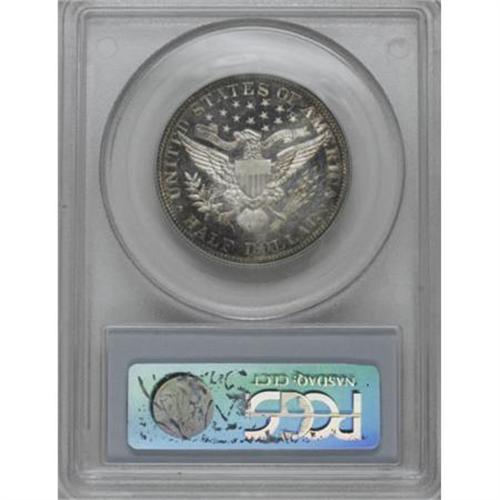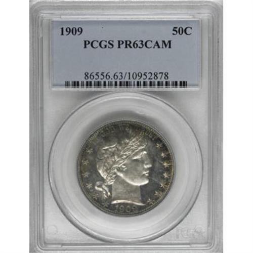 <B>1909 50C PR63 Cameo PCGS.</B></I> The amber and sapphire peripheral toning evident on both sides of this vibrant Select proof does not dim its strong contrast nor its immense reflectivity. The fields show faint hairlines, and Liberty's jaw shows two small points of contact. An elusive later Cameo Barber proof. Population: 4 in 63 Cameo, 36 finer (8/07).<BR><BR><b>Shipping:</b> Coins & Currency (<a target="_blank" href="http://www.heritageauctions.com/common/shipping.php">view shipping information</a>)