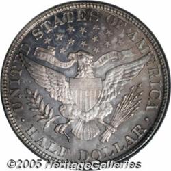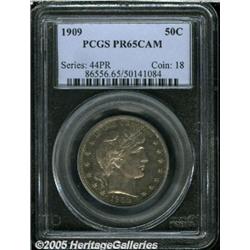 <B>1909 50C PR65 Cameo PCGS.</B></I> The immense eye appeal of this Gem specimen is derived from significant field-to-device contrast and irregular splashes of gray-lilac and sea-green iridescence in the areas surrounding the central features. Population: 6 in 65 Cameo, 16 finer (2/05).