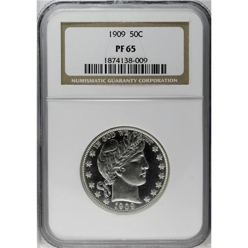 <B>1909<50C> PR65 NGC.</B></I> Fully brilliant and exhibiting almost limitless depth of mirrored reflectivity contrasting against subtly, chalk-white devices. Boldly defined throughout, only a couple of almost invisible hairlines are noted on Liberty's cheek.<BR><I>From The Mulholland Collection.</B></I>