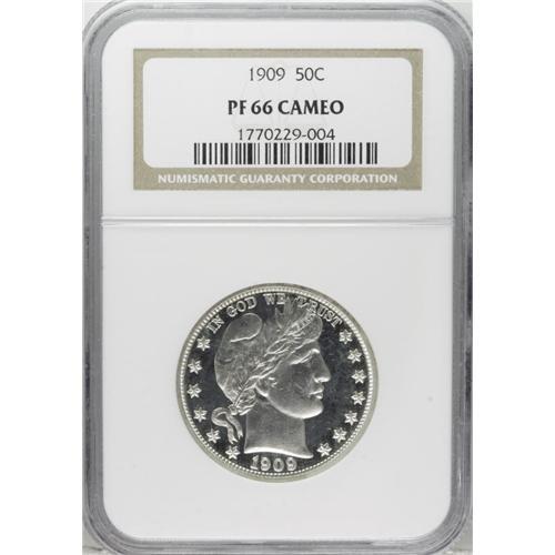 <B>1909 50C PR66 Cameo NGC.</B></I> The fields display seemingly fathomless depth. This reflectivity is so profound that it makes the light frosting on the devices seem all the more stark. The fragile fields are virtually unmarked and unspotted, practically pristine. An attractive specimen. Census: 4 in 66 Cameo, 14 finer (12/06).<BR><BR><b>Shipping:</b> Coin/Currency (<a target="_blank" href="http://www.heritageauctions.com/common/shipping.php">view shipping information</a>)