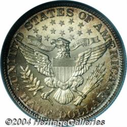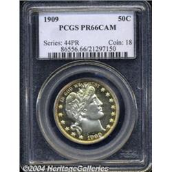 <B>1909<50C> PR66 Cameo PCGS.</B></I> Magnificent cameo contrast is lightly toned in two shades of gold color. Exquisitely struck throughout. A small toning spot in the lower left obverse field is noted for accuracy. Population: 5 in 66, 7 finer (7/04). <BR><BR><B>Important notice:</B> Heritage usually auctions material at the rate of 200-250 lots per hour. On some occasions eBay Live bid software or the Internet may not be able to keep up with the pace of the auction. We recommend placing a realistic absentee bid now as insurance to avoid disappointment. Occasionally the auctioneer may eliminate or reject an eBay Live bid, and the auctioneer may also reopen a lot after the close of the eBay live bidding (usually because we missed an audience bid), and may reject your bid even if it shows you as the winning bidder. By bidding via eBay Live, you agree that Heritage may award the lot to another bidder at its sole discretion under the circumstances described above or any other reasonable circumstances. Since eBay bids are not shown to us until we open the lot on the floor, we treat those bids just like floor bids. In most cases the floor responds before the eBay bid is presented to us, due to Internet lag time, so for consistency we have made it a policy that floor bids are always considered first over tie eBay live bids. Also please note that all Heritage lots purchased through eBay Live carry a 20% Buyer's Premium. Please make sure you read the Terms and Conditions before you bid. </span></font></tr></table></td></tr></table>