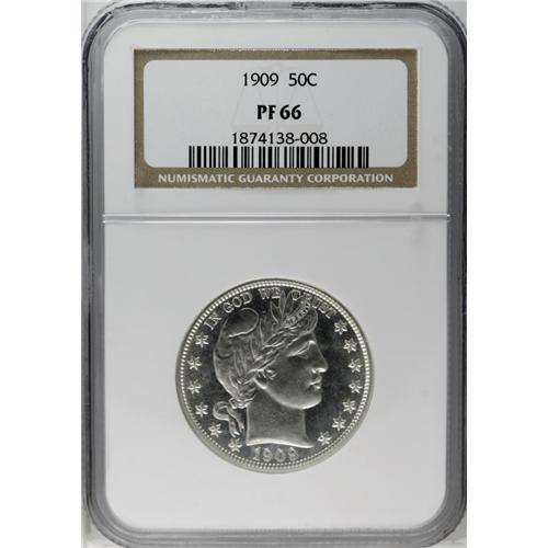 <B>1909<50C> PR66 NGC.</B></I> An especially well preserved proof Barber half dollar with surfaces that are nearly devoid of post-striking imperfections. Both sides present a brilliant, ice-white appearance and the strike is full and sharp throughout. Field-to-device contrast is modest, but quite attractive. Census: 48 in 66, 20 finer (6/06).<BR><I>From The Mulholland Collection.</B></I>