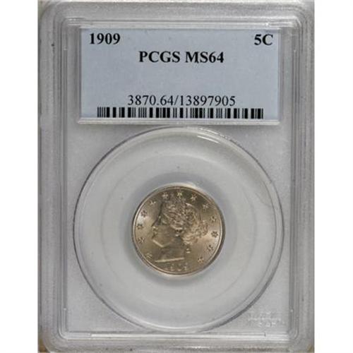 <B>1909 5C MS64 PCGS.</B></I> PCGS Population (150/76). NGC Census: (117/42). Mintage: 11,590,526. Numismedia Wsl. Price for NGC/PCGS coin in MS64: $192. (#3870)<BR><BR><B>Coin Engraver:</B> Charles E. Barber<BR><BR><b>Shipping:</b> Coins & Currency (<a target="_blank" href="http://www.heritageauctions.com/common/shipping.php">view shipping information</a>\)