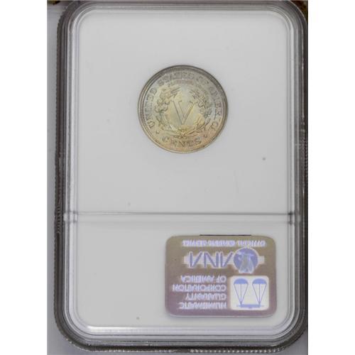<B>1909<5C> MS65 NGC.</B></I> This is an important opportunity as the date is the scarcest business strike among all 20th century Liberty nickels. The NGC Census figures in Gem quality indicate that it is the fifth rarest business strike in MS65 or finer grades, behind only 1885, 1886, 1895, and 1896. This is a lovely Gem with frosty light gray surfaces accented by pale gold and iridescent toning, somewhat more vibrant on the reverse. Census: 36 in 65, 9 finer (4/06).