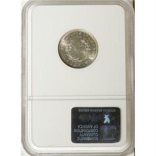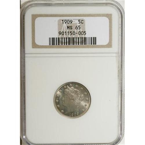 <B>1909 5C MS65 NGC.</B></I> Lightly toned and highly lustrous, with generally bold striking details except for the reverse left ear of corn. Surface marks are minimal. An attractive, high-grade type coin. Census: 34 in 65, 8 finer (8/07).<BR><BR><B>Coin Engraver:</B> Charles E. Barber<BR><BR><b>Shipping:</b> Coins & Currency (<a target="_blank" href="http://www.heritageauctions.com/common/shipping.php">view shipping information</a>)