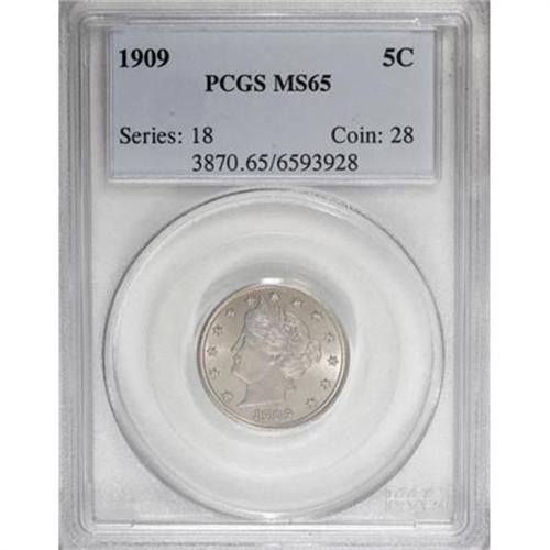 <B>1909 5C MS65 PCGS.</B></I> Despite a reasonably high mintage, in excess of 11.5 million coins, the 1909 Liberty nickel is scarce at the Gem level of preservation, and rare any finer; with none at all graded above MS66 (10/07). A tad weak on the hair detail above Liberty's forehead and temple areas, and on the reverse left ear of corn; most of the other design elements are crisply outlined. Strong cartwheel luster radiates from the champagne-tan and lilac-gray surfaces, that show minimal blemishes. Population: 49 in 65, 21 finer (10/07). <BR><BR><B>Coin Engraver:</B> Charles E. Barber<BR><BR><b>Shipping:</b> Coins & Currency (<a target="_blank" href="http://www.heritageauctions.com/common/shipping.php">view shipping information</a>)