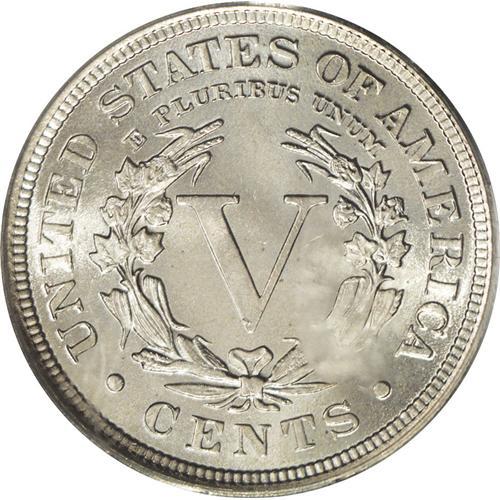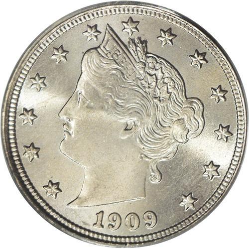 <B>1909<5C> MS66 PCGS.</B></I> Ex: Baxi. This date has the lowest mintage of any Philadelphia Mint Liberty nickel struck from 1897 to 1912, and it is the tenth lowest mintage issue among all 33 date and mintmark issues from 1883 to 1912. The present example, a Premium Gem quality coin, is tied for the finest certified by either PCGS or NGC. The surfaces are highly lustrous with brilliant light gray color and hints of pale gold toning. It is also a sharply struck example, with the only noticeable weakness occurring at the lower left part of the wreath. A remarkable example with exceptional eye appeal, and destined to join a high quality Set Registry collection of Liberty Head nickels.