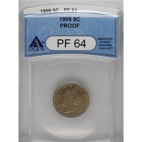 <B>1909 5C PR64 ANACS.</B></I> NGC Census: (282/668). PCGS Population (348/536). Mintage: 4,763. Numismedia Wsl. Price for NGC/PCGS coin in PR64: $220. (#3907)<BR><BR><b>Shipping:</b> Coins & Currency (<a target="_blank" href="http://www.heritageauctions.com/common/shipping.php">view shipping information</a>)