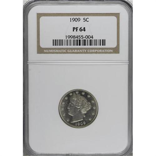 <B>1909 5C PR64 NGC.</B></I> NGC Census: (285/674). PCGS Population (347/539). Mintage: 4,763. Numismedia Wsl. Price for NGC/PCGS coin in PR64: $220. (#3907)<BR><BR><B>Coin Engraver:</B> Charles E. Barber<BR><BR><b>Shipping:</b> Coins & Currency (<a target="_blank" href="http://www.heritageauctions.com/common/shipping.php">view shipping information</a>)