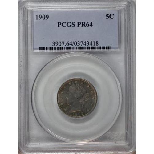 <B>1909 5C PR64 PCGS.</B></I> PCGS Population (352/551). NGC Census: (290/679). Mintage: 4,763. Numismedia Wsl. Price for NGC/PCGS coin in PR64: $220. (#3907)<BR><BR><B>Coin Engraver:</B> Charles E. Barber<BR><BR><b>Shipping:</b> Coins & Currency (<a target="_blank" href="http://www.heritageauctions.com/common/shipping.php">view shipping information</a>)