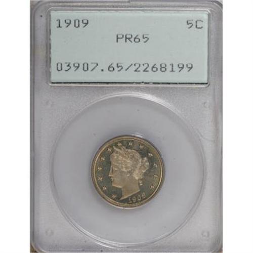 <B>1909 5C PR65 PCGS.</B></I> PCGS Population (306/232). NGC Census: (326/346). Mintage: 4,763. Numismedia Wsl. Price for NGC/PCGS coin in PR65: $484. (#3907)<BR><BR><B>Coin Engraver:</B> Charles E. Barber<BR><BR><b>Shipping:</b> Coins & Currency (<a target="_blank" href="http://www.heritageauctions.com/common/shipping.php">view shipping information</a>)