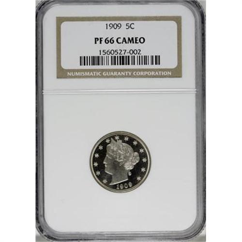 <B>1909 5C PR66 Cameo NGC.</B></I> A simply exquisite later Liberty nickel proof. Both sides offer bold black-and-white contrast. Razor sharp definition complements the coin's distinct Cameo effect, and the surfaces are pleasingly preserved. Census: 35 in 66 Cameo, 32 finer (10/07).<BR><BR><b>Shipping:</b> Coins & Currency (<a target="_blank" href="http://www.heritageauctions.com/common/shipping.php">view shipping information</a>)