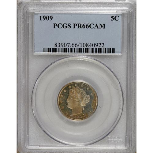 <B>1909 5C PR66 Cameo PCGS.</B></I> Cherry-red, gold, pale rose, and lime enrich this prominently mirrored Premium Gem. A few pinpoint reverse flyspecks deny aesthetic perfection. Population: 43 in 66 Cameo, 9 finer (2/07).<BR><BR><b>Shipping:</b> Coins & Currency (<a target="_blank" href="http://www.heritageauctions.com/common/shipping.php">view shipping information</a>)