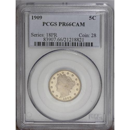 <B>1909<5C> PR66 Cameo PCGS.</B></I> Sharply struck with bright, lightly toned, highly reflective surfaces that seem pristine. Beautiful white-on-black contrast is evident on the obverse, as well as the reverse, this being accented with pastel-golden patina. Population: 41 in 66, 8 finer (2/06).