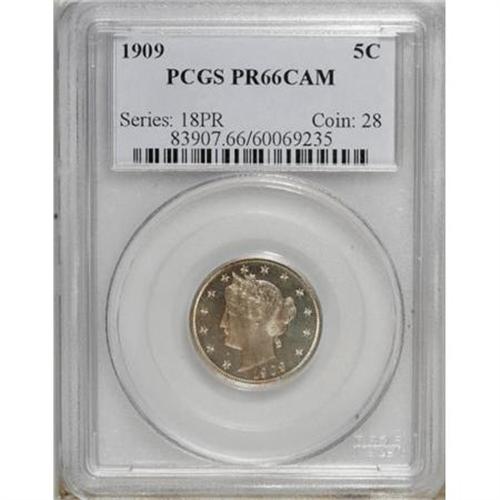 <B>1909 5C PR66 Cameo PCGS.</B></I> The portrait and wreath are frosty, and the medium tawny-gold toning only confirms the originality. Sharply struck and carbon-free. Population: 45 in 66 Cameo, 10 finer (1/08).<BR><I>Ex: Williams Collection (Heritage, 3/03), lot 5832; Heritage, (5/03), lot 5704.</B></I><BR><BR><b>Shipping:</b> Coins & Currency (<a target="_blank" href="http://www.heritageauctions.com/common/shipping.php">view shipping information</a>)