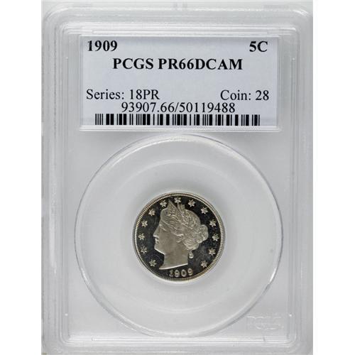 <B>1909 5C PR66 Deep Cameo PCGS.</B></I> The brilliant surfaces are heavily contrasted with intense mint frost over the devices, which is set against the illimitable depth of mirrored reflectivity in the fields. Population: 5 in 66 Deep Cameo, 0 finer (10/06).<BR><I>From The Paul Vine Collection.</B></I><BR><BR><b>Shipping:</b> Coin/Currency (<a target="_blank" href="http://www.heritageauctions.com/common/shipping.php">view shipping information</a>)