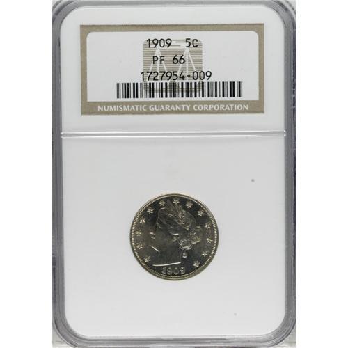 <B>1909 5C PR66 NGC.</B></I> Speckles of milky toning are joined by whispers of champagne-gold on the obverse. Bright reflective surfaces are devoid of significant marks and exhibit sharply struck design elements. NGC has certified 91 pieces finer (4/07).<BR><BR><b>Shipping:</b> Coins & Currency (<a target="_blank" href="http://www.heritageauctions.com/common/shipping.php">view shipping information</a>)